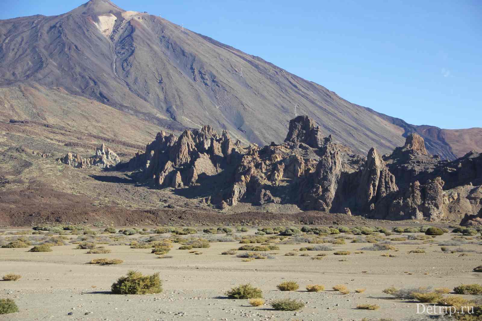 По дороге к вулкану обратите внимание на скалы де Гарсия, привлекающие своей необычной формой. Наиболее известная скала называется «Палец бога». Именно ее изображение можно встретить в путеводителях и открытках. Это один из самых узнаваемых символов Тенерифе. Узнать ее можно по виду: основание скалы значительно тоньше верхушки. Мы даже делали остановку в этом месте. Это чудо создано самой природой. Смотришь и удивляешься, как же у нее получается творить такие шедевры. Скалы Рокес де Гарсия образовались в результате неравномерного разрушения стены из вулканической лавы, некогда разделявшей кальдеру на две части.